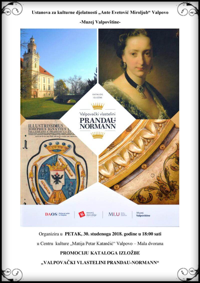 U sklopu manifestacije „Dan grada Valpova“, Ustanova za kulturne djelatnosti „Ante Evetović Miroljub“ Valpovo – Muzej Valpovštine, organizira promociju kataloga velebne izložbe „Valpovački vlastelini Prandau-Normann“ u PETAK, 30. studenoga 2018. godine s početkom u 18:00 sati u maloj dvorani Centra kulture „Matija Petar Katančić“ Valpovo.