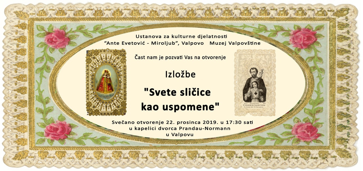 U sklopu programa „Advent u Valpovu“ Muzej Valpovštine priređuje prigodnu izložbu „Svete sličice kao uspomene.“ Svečano otvorenje izložbe biti će u nedjelju 22. prosinca 2019. godine u 17:30 sati u dvorskoj kapeli Svetog Trojstva. Dobro došli!