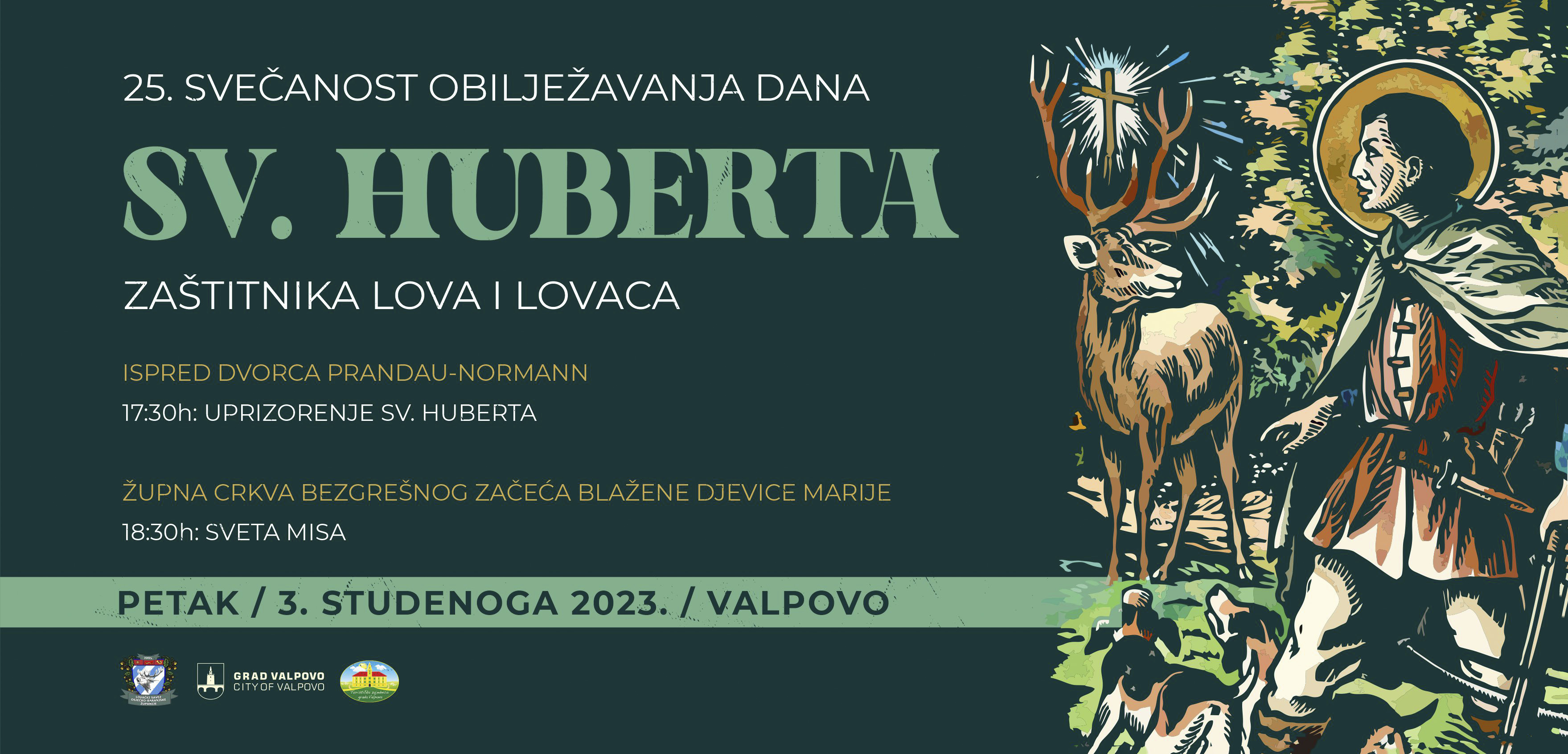 U organizaciji Lovačkog saveza Osječko-baranjske županije, Grada Valpova, Turističke zajednice Grada Valpova, Lovačkog društva „Šljuka“ Valpovo te brojnih partnera, u petak, 3. studenoga 2023. godine, Grad Valpovo će biti domaćin 25. svečanosti obilježavanja Dana sv. Huberta – zaštitnika lova i lovaca.